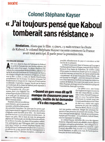 Nous vous invitons à lire ou relire le témoignage du colonel Stéphane KAYSER - attaché de défense de l’ambassade de France à Kaboul en août 2021, publié dans le n° 2767 du magazine Le Point du 7 août 2025. La première page de ce reportage - qui en compte quatre - est reprise ci contre. |