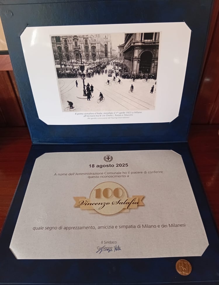 VICENZO SALAFIA, le père de notre illustrateur préféré, Fulvio de Milan, a eu 100 ans le 15 août 2025 ! À cette occasion mémorable de l’atteinte de son 1er siècle, la mairie de Milan lui a offert une splendide médaille et une photo datée de 1925, son année de naissance, d’une célèbre place de la ville. Sauriez-vous l’identifier ? Allez, je vous aide : elle se trouve entre le Duomo et le Castello Sforza…BUON COMPLEANNO! AUGURI! |