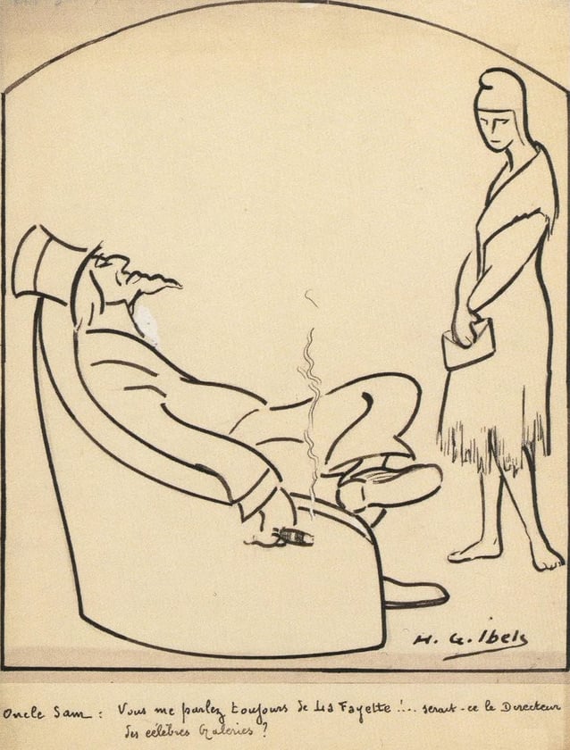 Quittons Lafayette et Roy sur la pointe des pieds mais avec le sourire grâce à un dessin d’Henri-Gabriel Ibels (1867-1936), artiste fondateur du groupe des Nabis. Il s’était illustré par son engagement social et politique, notamment durant l’affaire Dreyfus. Peut-être avez-vous parcouru l’exposition que le musée départemental Maurice Denis de St Germain en Laye lui a consacré du 25 novembre dernier au 1er mars 2026 ? Non, deuxième chance : elle sera bientôt présentée au musée Toulouse-Lautrec d’Albi, du 4 avril au 26 juillet. Légende du dessin : ‘Oncle Sam : Vous me parlez toujours de Lafayette ! … Serait-ce le directeur des célèbres galeries ?’ |