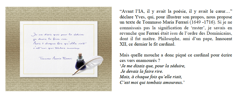De son côté, Yves de New-York, tout en reconnaissant que, “pour une béotienne cette histoire d'IA est déroutante.” rappelle que “CANVA ne peut pas remplacer l'artiste qui crée ! Il peut seulement donner des idées. Et moi, entre l’intelligence artificielle et la vraie bêtise, je suis dubitatif”.