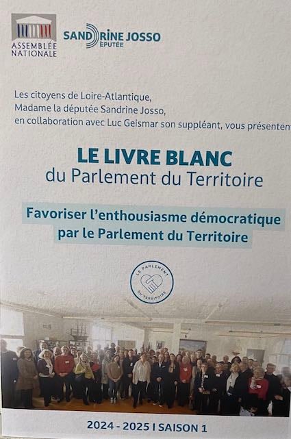 Initié par Sandrine Josso, députée de la 7e circonscription de Loire-Atlantique (Guérande, La Baule, Pontchâteau) et animé par elle-même, son suppléant Luc Geismar et une équipe mobilisée et enthousiaste, le Parlement du Territoire a présenté, le 26 avril dernier, la restitution des travaux de sa première année d’existence, laquelle a donné lieu à la publication d’un Livre Blanc, qui traite les différentes thématiques étudiées : santé et prévention, justice et sécurité, environnement jeunesse, éducation, recherche; vie démocratique locale. Transmis aux institutions (préfecture, ministères, écoles, gendarmerie, commissariats), ainsi qu'aux partenaires locaux, nous pouvons vous le faire parvenir au format pdf. Il suffit d’en exprimer la demande en commentaire de ce numéro ou même par courriel direct à la rédactrice en chef.
